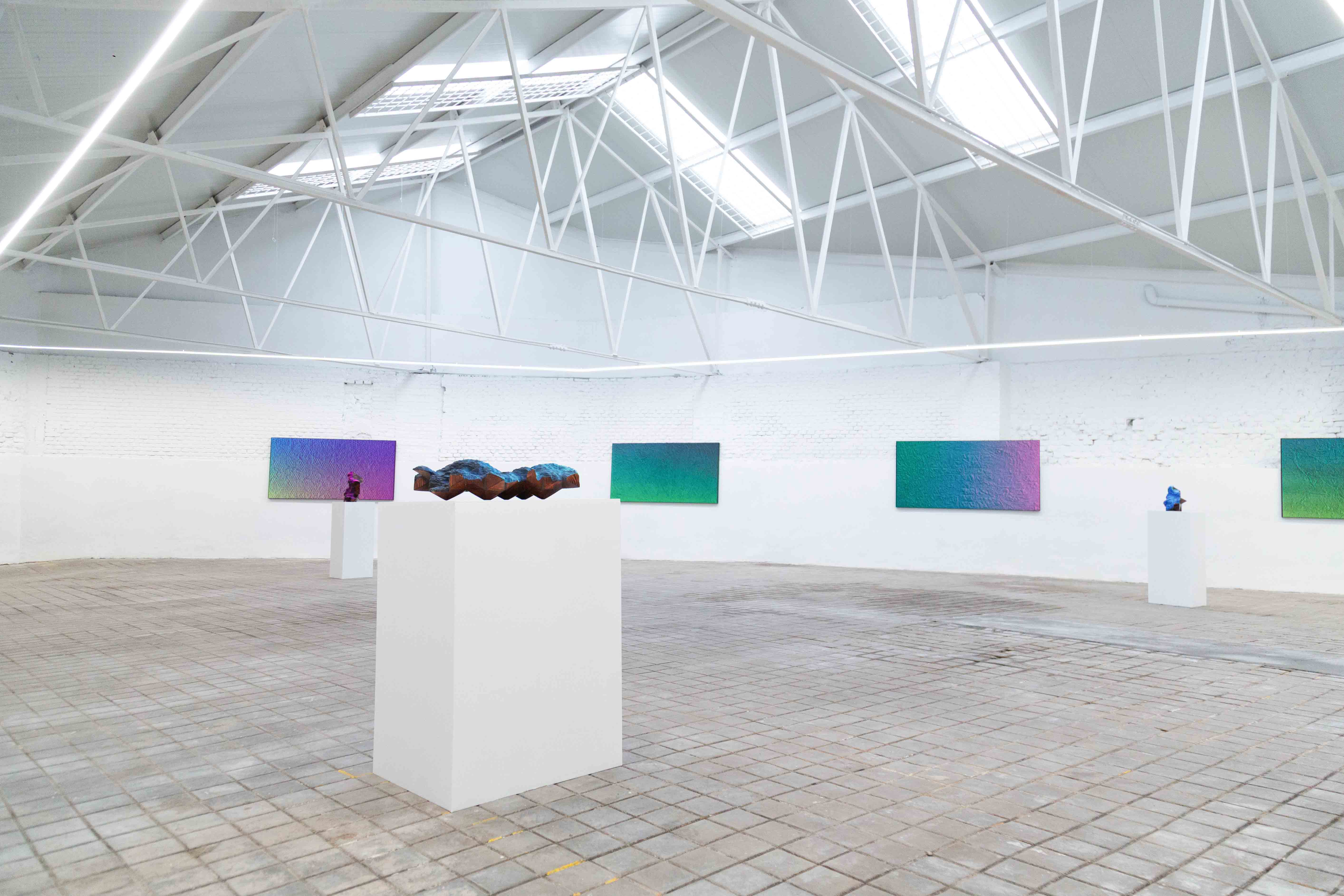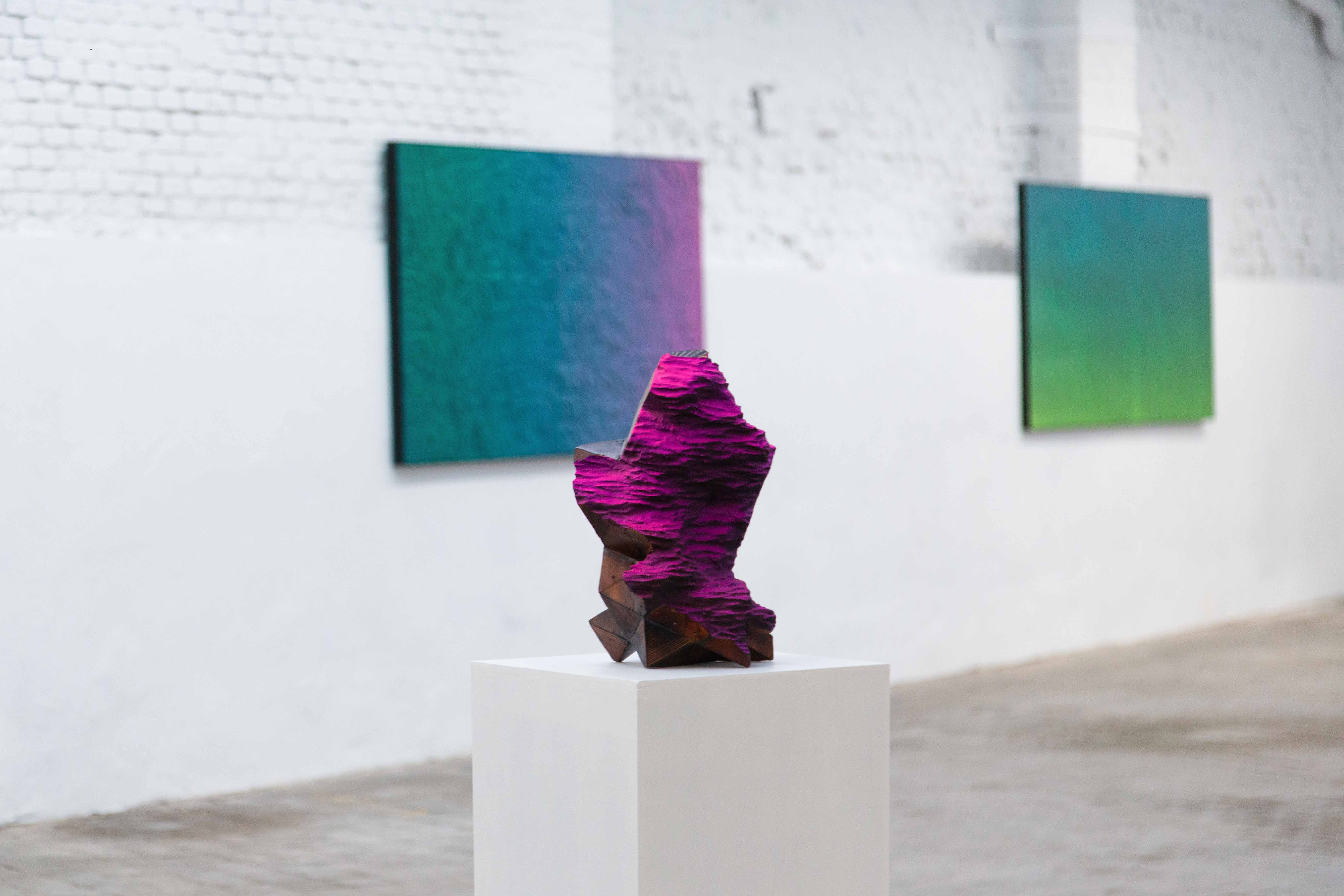 Alongside these paintings, Staniak exhibits three wooden sculptures exploring geometric forms such as triangles and hexagons, referencing fundamental principles of quantum physics and simulation theory. These pieces reinforce his investigation into the nature of reality, the interplay between material and virtual realms, and the tension between the unique and the reproducible. In this sense, his work resonates with debates surrounding post-internet art, characterized by the dissolution of physical space into digital culture and a reflection on the circulation of images in the age of immediacy. Staniak’s practice aligns with broader discussions on technological evolution and its impact on artistic production, engaging with theorists such as Gene McHugh, Marisa Olson, and Boris Groys, among others.