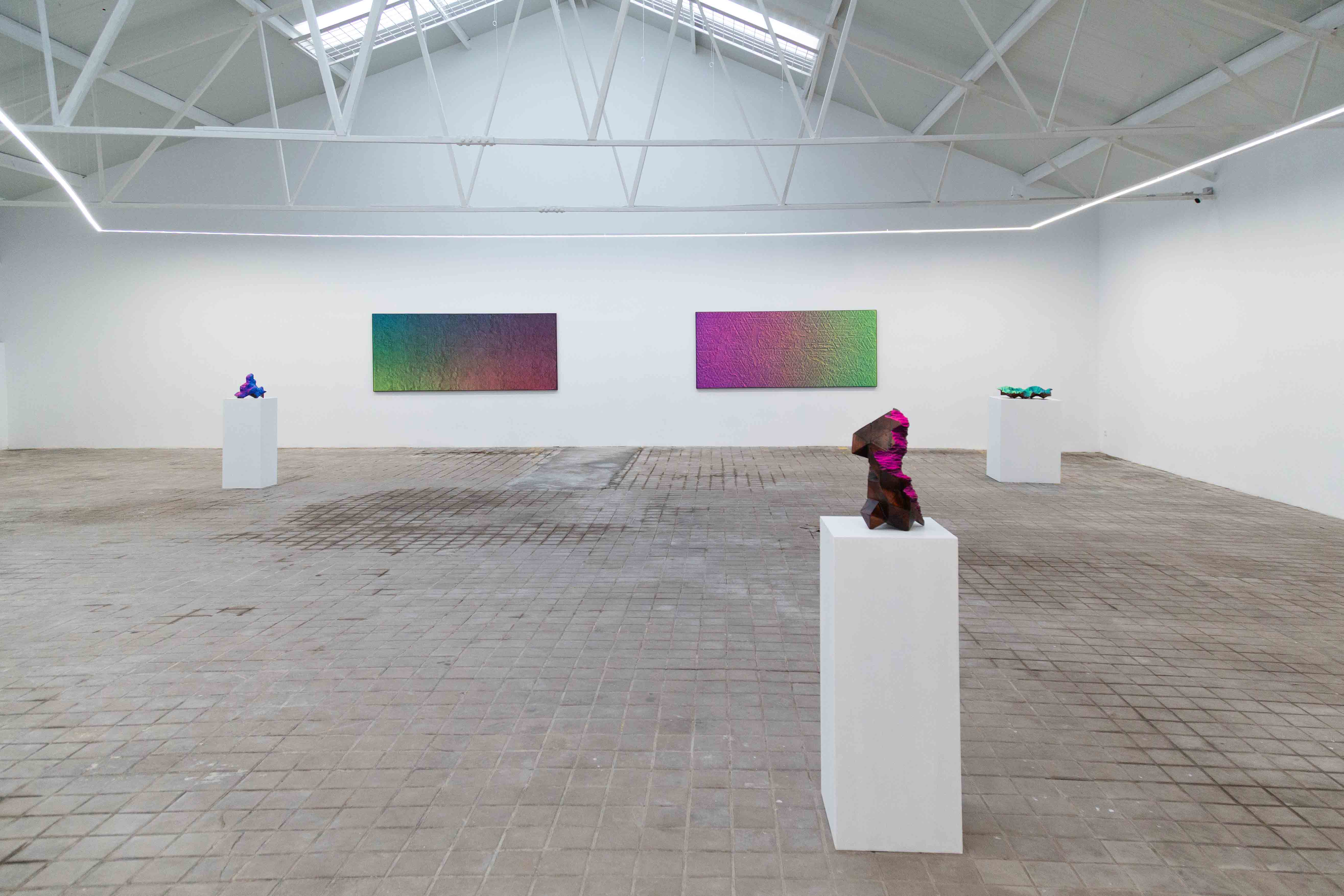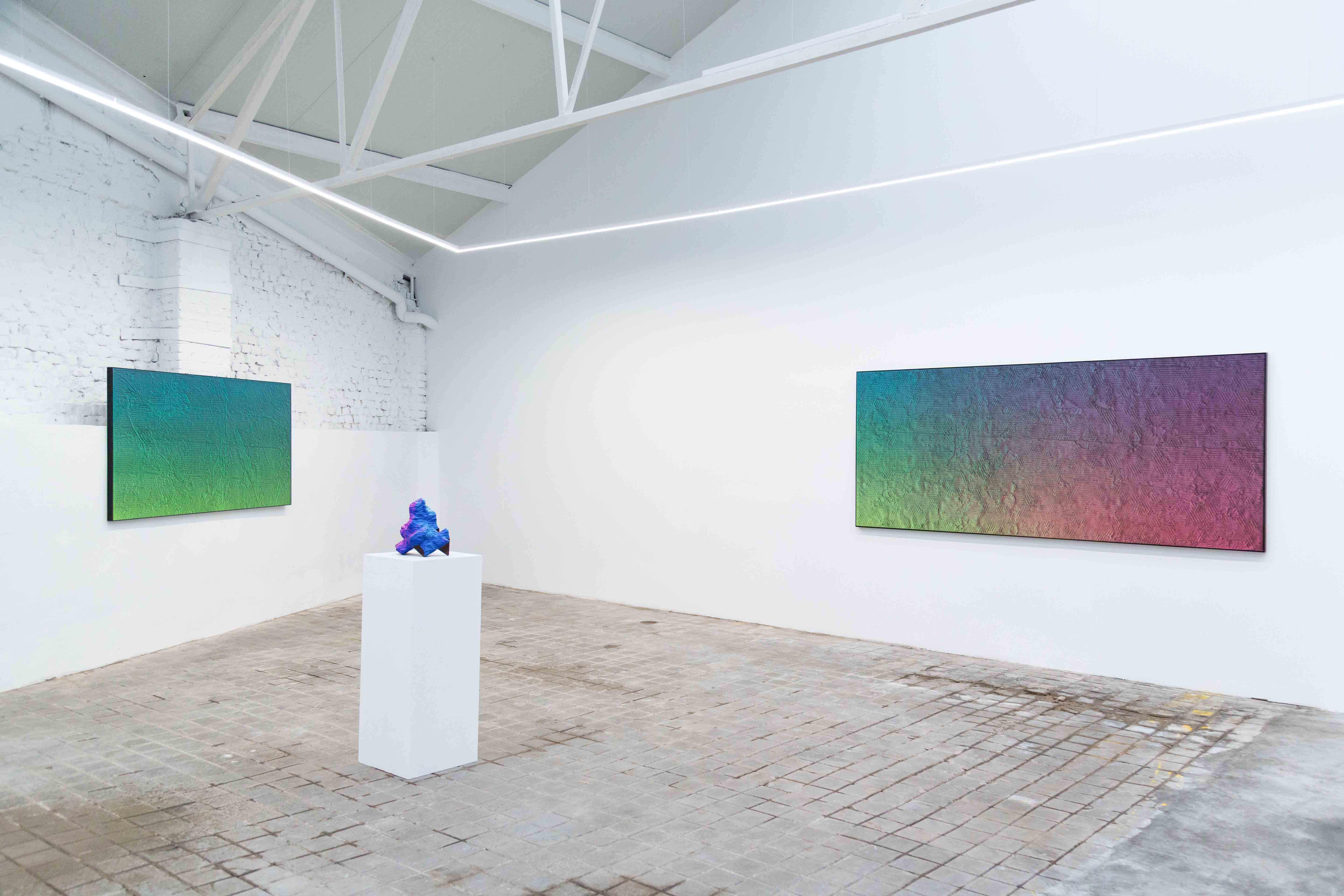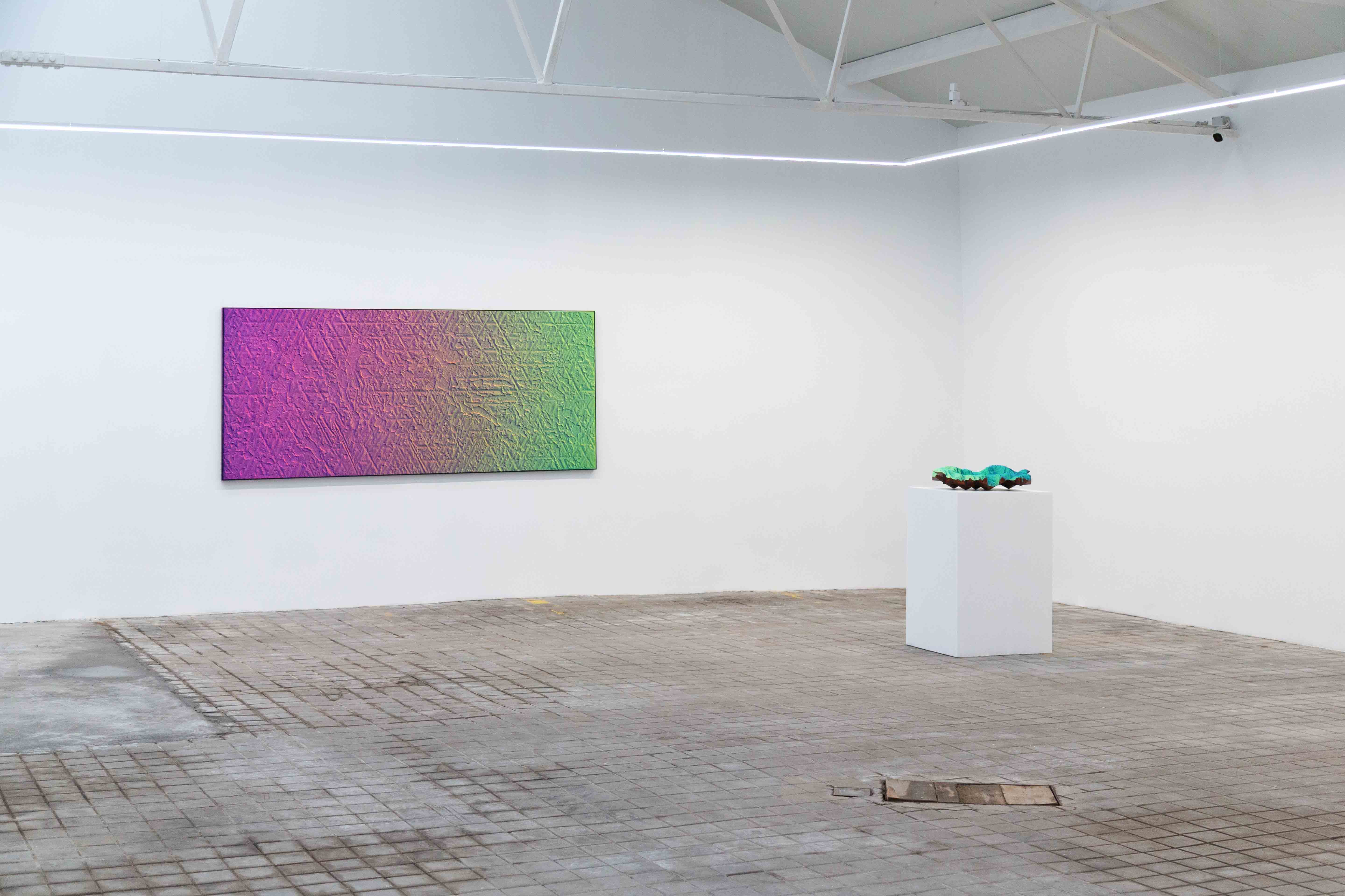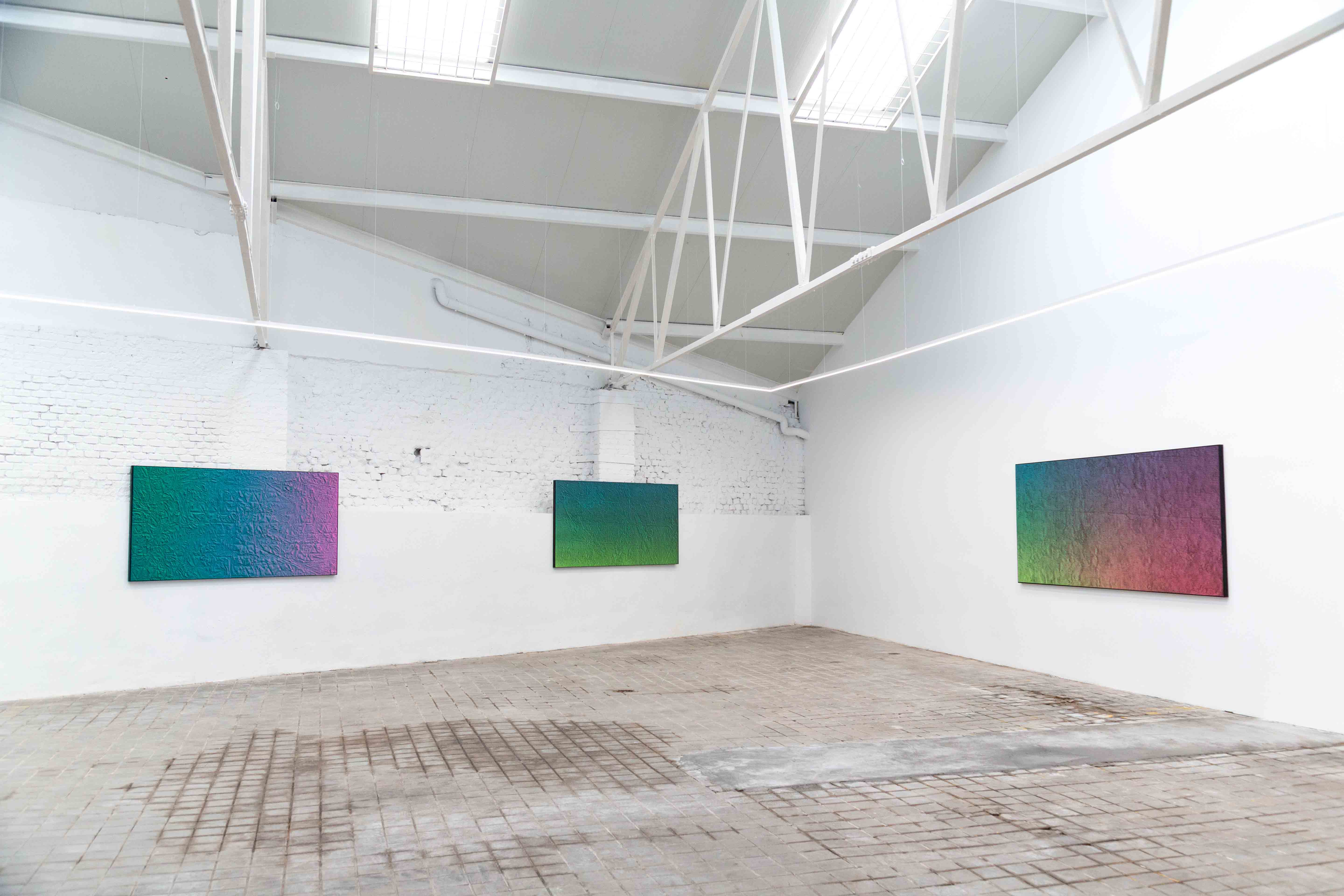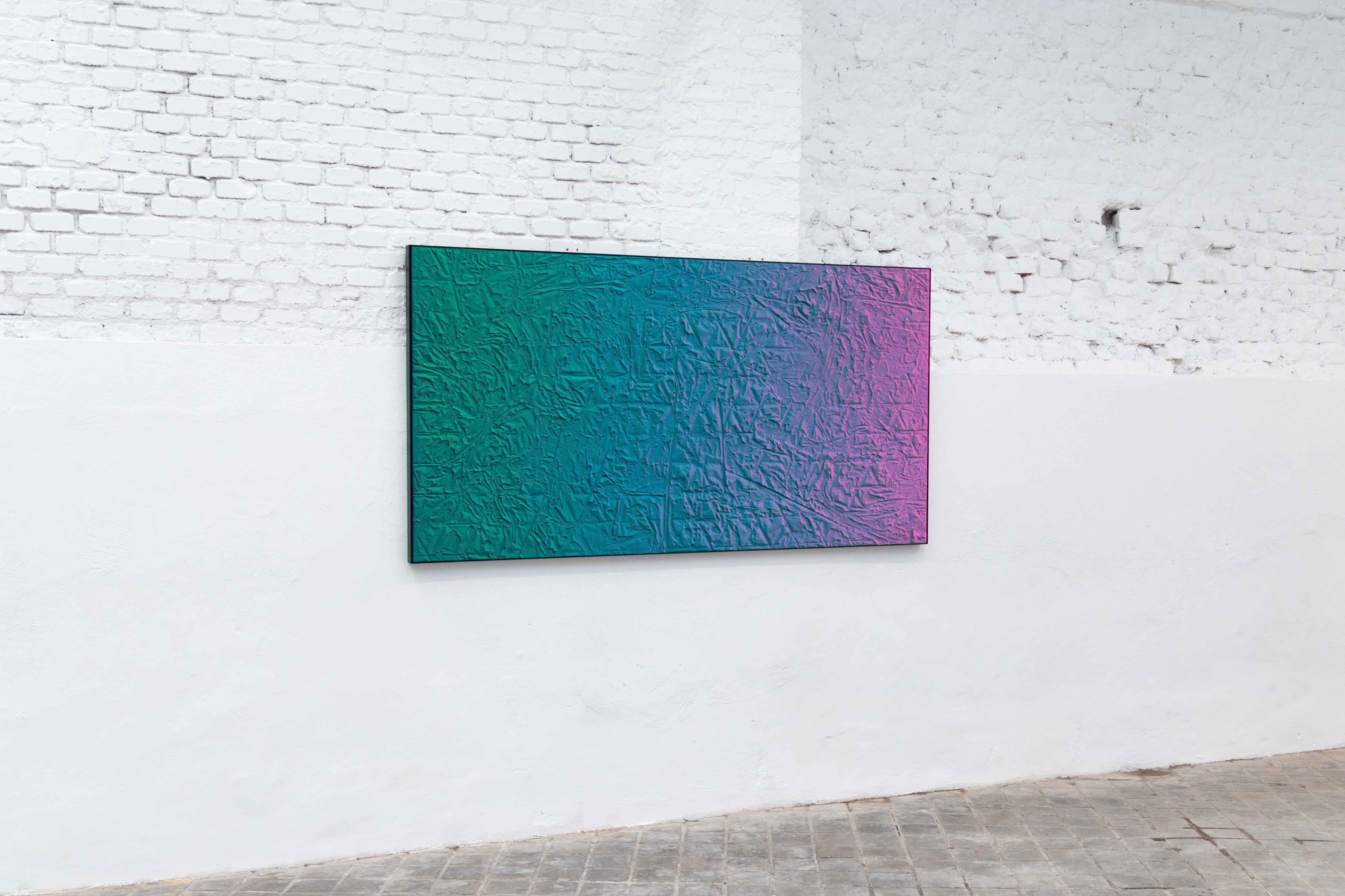 A fundamental axis of his work is the duality between the analog and the digital. His paintings, with their gradients of vibrant colors, initially appear flat when seen in person, evoking the aesthetics of computer-generated images. However, upon closer examination—or even when viewed on a screen—unexpected textures and reliefs emerge, the result of manual processes that contrast with the algorithmic perfection to which we have become increasingly accustomed. This play of perception exposes the limitations of digital reproduction and reclaims the direct encounter with the artwork. At a time when images are constantly compressed, edited, and consumed through digital interfaces, Staniak invites us to reconsider the value of the tangible and the handcrafted, immersing us in a game between what seems to be and what truly is, challenging our dwindling capacity for attention.